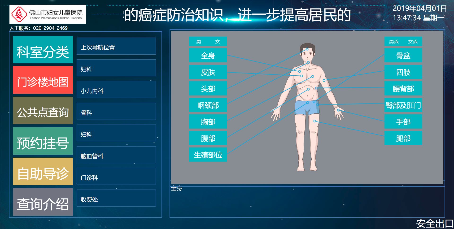 機(jī)器人通過(guò)語(yǔ)音提示指引患者查詢需要就診的科室,例如:患者頭痛,機(jī)器人會(huì)通語(yǔ)音提示患者按相應(yīng)的操作,進(jìn)一步判斷需要就診的科室,并且顯示圖文介紹和語(yǔ)音提示。 同時(shí)彈出醫(yī)院掛號(hào)的微信二維碼,方便患者輕松掛號(hào)。