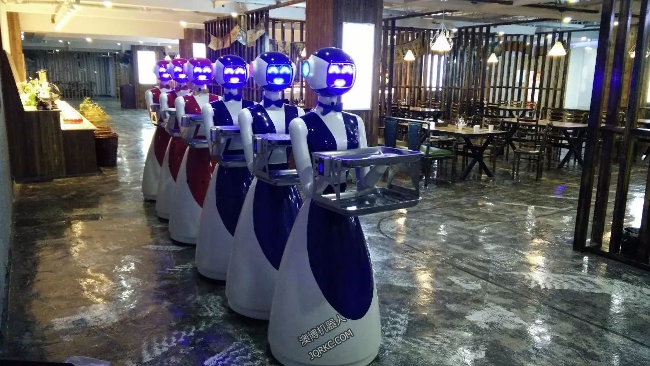 圖為一家采用澳博餐廳機器人的餐廳,6臺澳博餐廳機器人可以同時送餐服務(wù),減少人力投入降低成本,還能與客人互動,增加餐廳整體氛圍,吸引更多人氣。