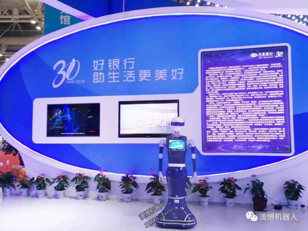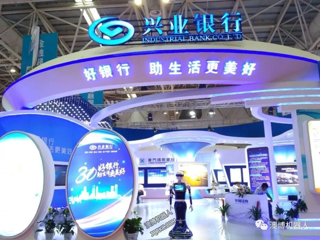 人型機器人藍豆在展會上,帶領(lǐng)參展觀眾全面了解興業(yè)銀行成立三十年的發(fā)展歷程,體驗該行全新的高科技金融服務(wù)產(chǎn)品、為在場的客人提供帶領(lǐng)引導(dǎo),金融知識講解服務(wù)。