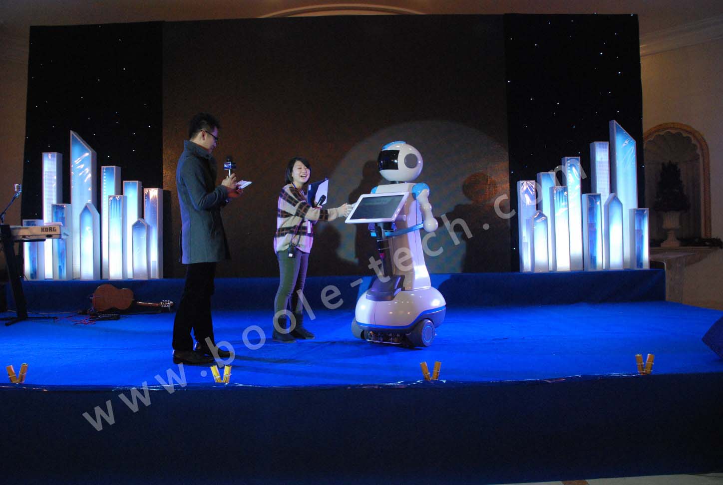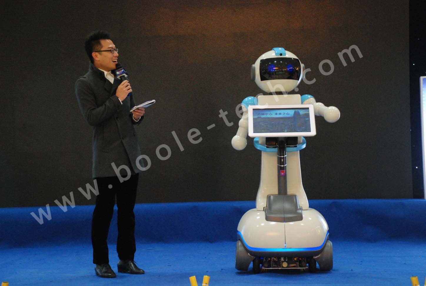 主要功能語(yǔ)音播報(bào)語(yǔ)音講解、語(yǔ)音交互??山Y(jié)合實(shí)際需要輸入需要播報(bào)、講解、交互的各種專業(yè)信息,眼睛和嘴部由LED燈組成,說(shuō)話時(shí)LED等會(huì)亮亮起,配合語(yǔ)音內(nèi)容做出各種表情,可愛(ài)活潑,惹人喜愛(ài),胸前液晶顯示屏?xí)峁┎?bào)講解的文字內(nèi)容。