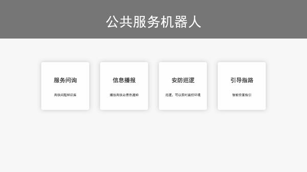 - 高鐵站+機器人解決方案 產(chǎn)品介紹 每當(dāng)節(jié)假日,高鐵站客流大量增加,咨詢客服人員需要排隊等候,大大降低了高鐵站的服務(wù)質(zhì)量。智能機器人可以高效完成服務(wù)問詢、位置指引,信息...